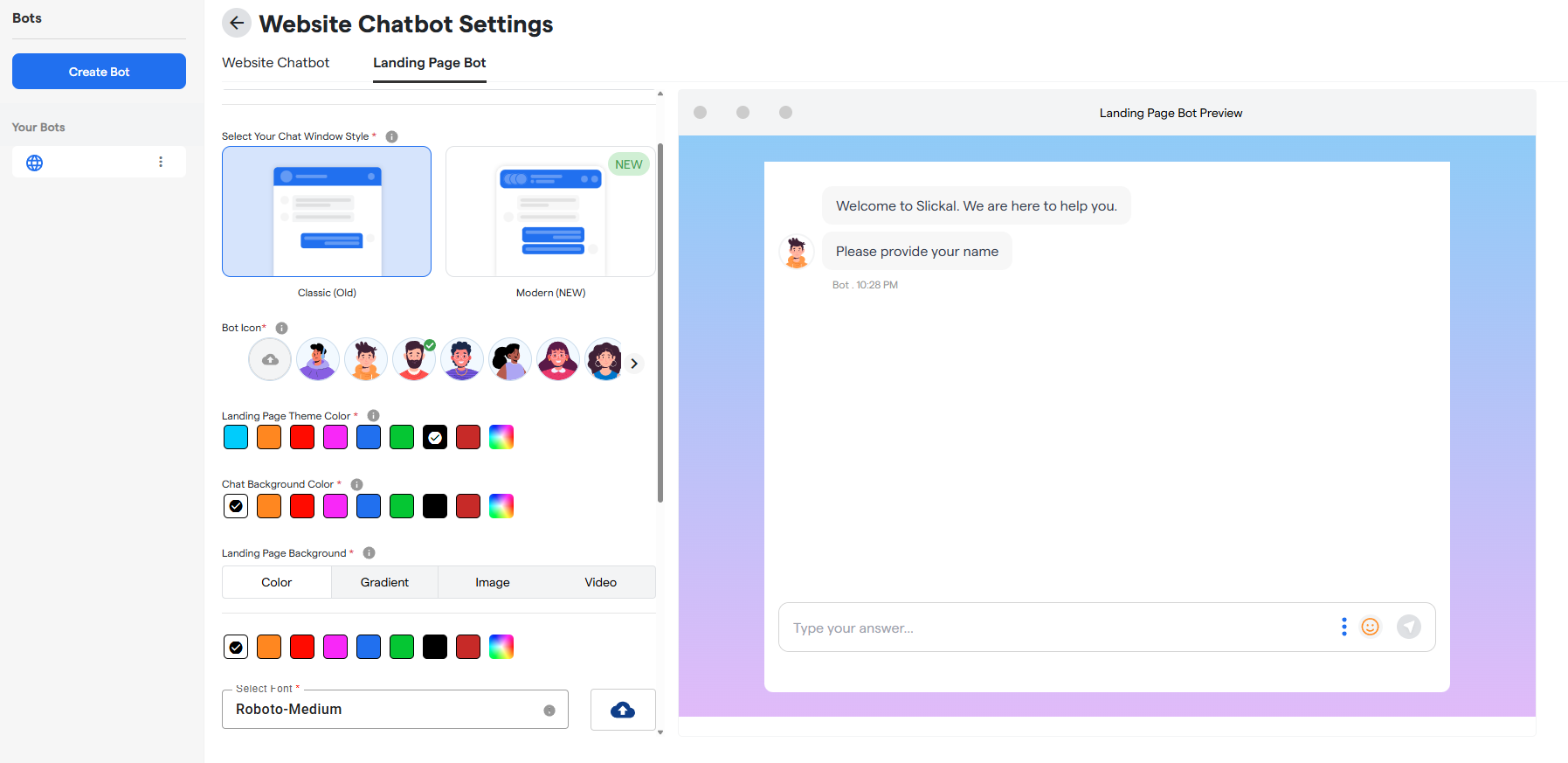 Je kiest de chatstijl (klassiek of modern), het icoon van de bot, kleuren voor het venster en de achtergrond (kleur, verloop, afbeelding of video).