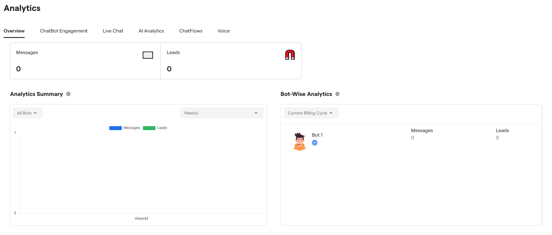 Hier zie je statistieken van je Chatbot. Je kunt volgen hoeveel berichten en leads er zijn ontvangen. De grafieken en tabellen tonen deze gegevens per bot en per periode.