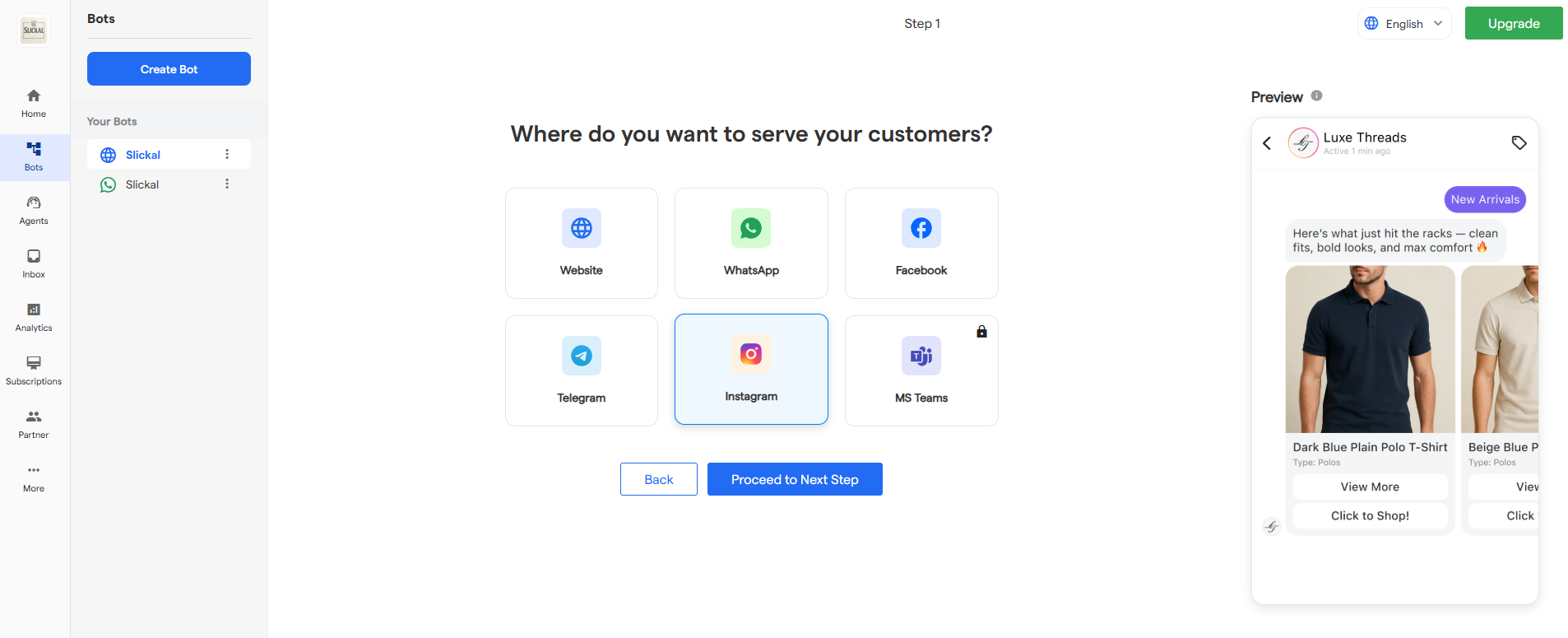 Log in op Slickal, start een nieuwe bot en kies Instagram als het kanaal voor je bot.