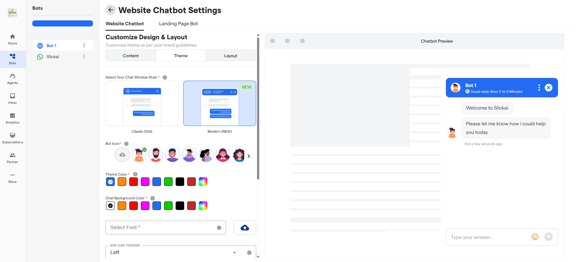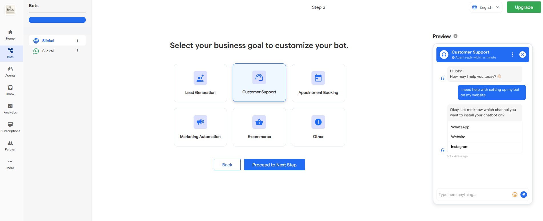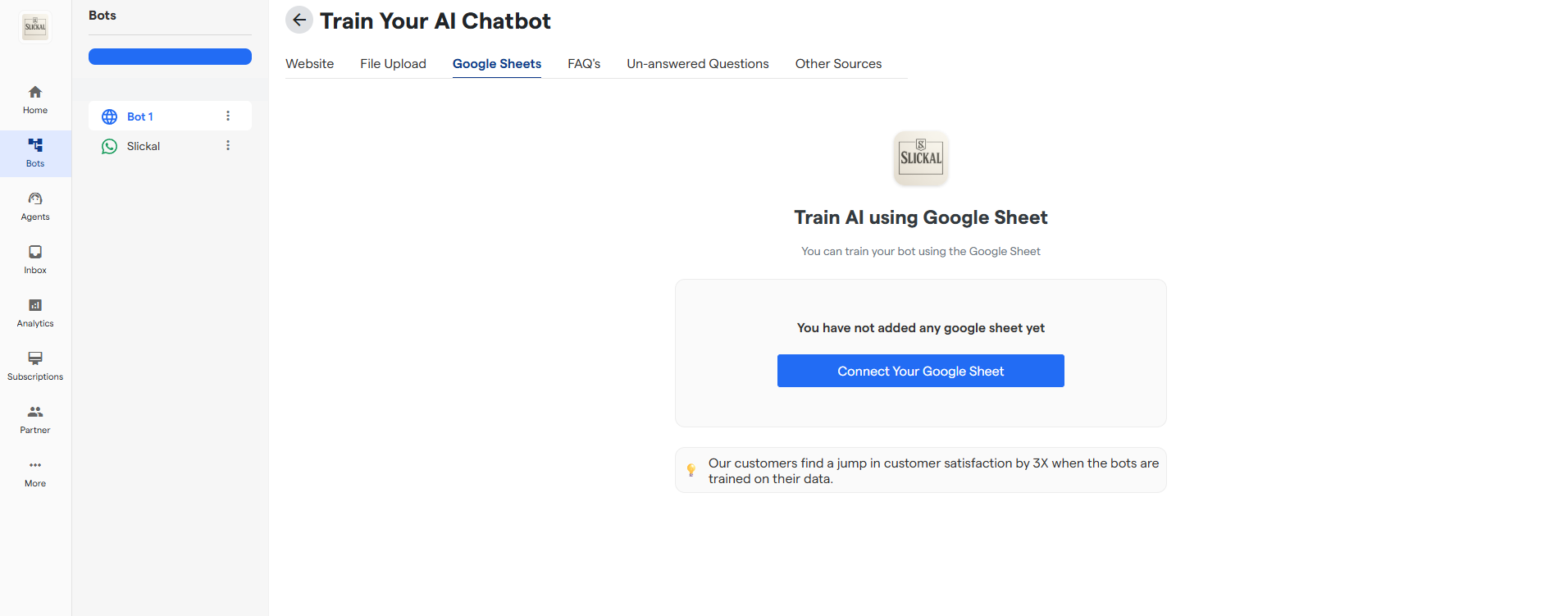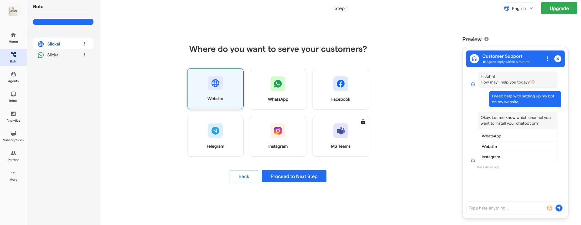 Bezoek het Slickal-dashboard om de functionaliteit van uw chatbot te testen en te controleren of alles soepel werkt op uw website.
