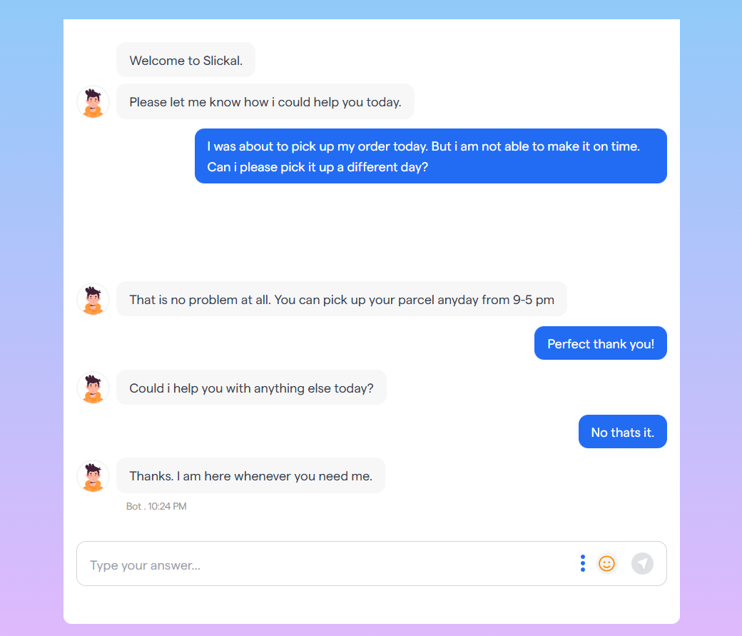 Slickal's chatbot for websites handles everything from order pickup to customer support. Create the best shopping experience your customers deserve.