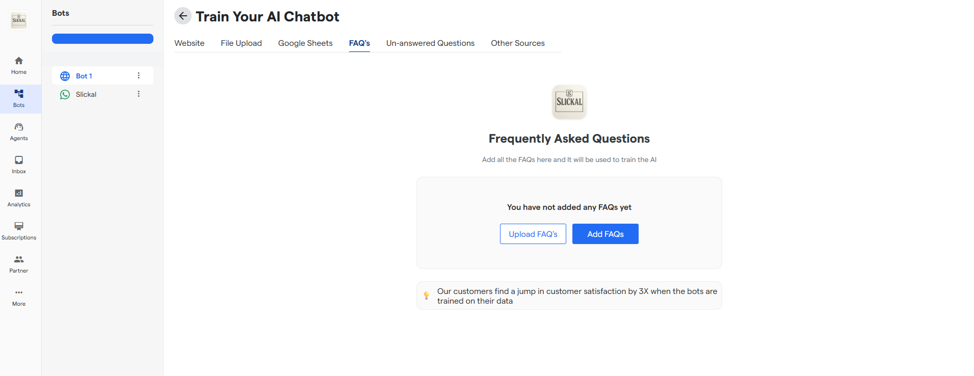 U kunt de AI-bot trainen met aangepaste datasets, URL-scraping, veelgestelde vragen, een kennisbank en klantinteracties.
